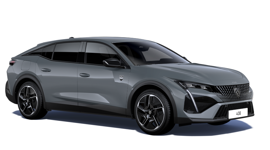 De dynamische en innovatieve fastback Peugeot E-408 berline straalt moderne elegantie en een assertieve houding uit, met zijn katachtige en scherpe lijnen.